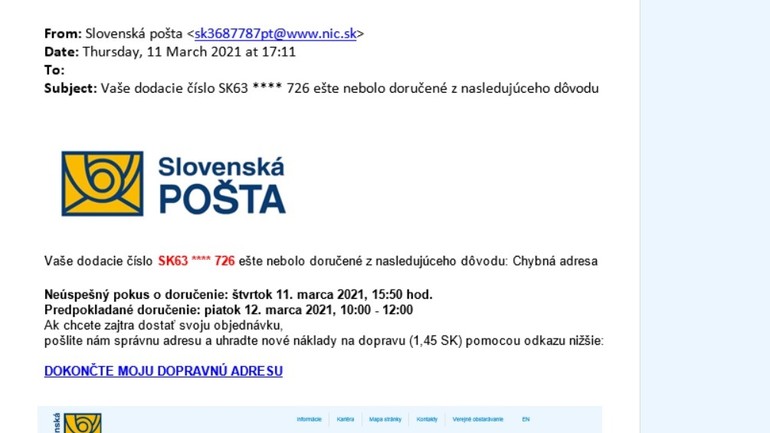 Slovenská pošta zaznamenala už viac ako 20 typov podvodných e-mailov, ktoré sa „tvária“, akoby ich odosielateľom bola pošta. Adresáta vyzývajú k úhrade platieb za doručenie zásielky, k zmene doručeniu či uloženiu zásielky či zaplateniu colných poplatkov.