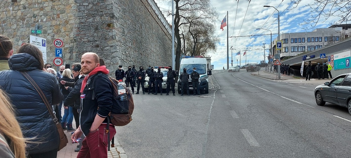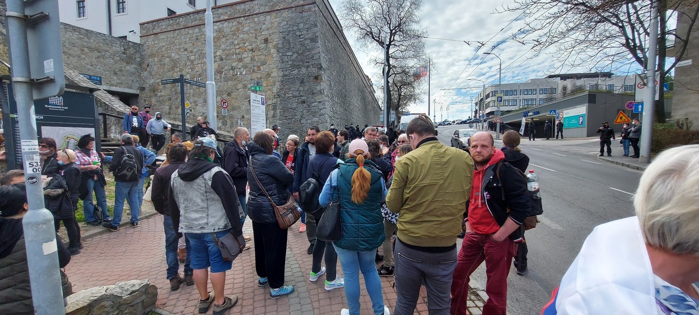 Na Zámockej ulici sa zhromaždilo dnes len niekoľko desiatok nespokojných občanov, ktorých bezpečnostné zložky do blízkosti parlamentu ani len nepustili. Azda najdramatickejšia chvíľa nastala, keď sa jeden z okoloidúcich motoristov rozhodol povzbudiť či pozdraviť ľudí stojacich na chodníku trúbením zo svojho auta. Prítomný dopravný policajt ho šiel pravdepodobne upozorniť na nevhodnosť používanie výstražného zvukového znamenia v tejto situácii, ale vodič si jeho slová nevzal k srdcu a zatrúbil a zakýval spoza volantu "davu" ešte raz: