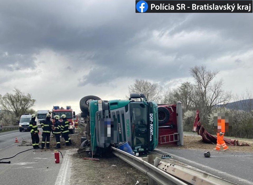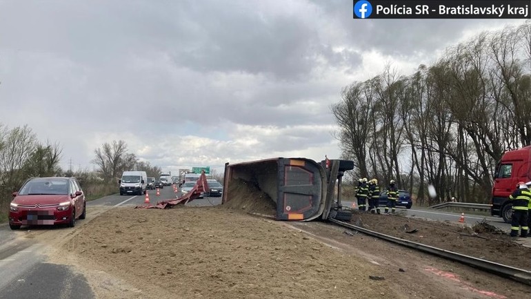 FOTO: Na diaľnici D2 sa prevrátil kamión so zeminou - prejazdný je len jeden pruh v každom smere
