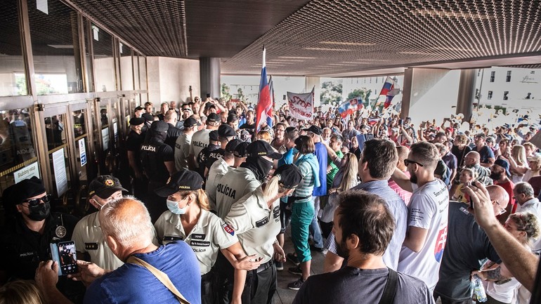 Pred budovou parlamentu v hlavnom meste sa v piatok ráno zišli stovky nespokojných občanov. Protestujú proti vládnym opatreniam v súvislosti s pandémiou nového koronavírusu. Žiadajú, aby v parlamente nebola prijatá novela zákona, v rámci ktorej by sa malo pri tvorbe protipandemických opatrení prihliadať na digitálny COVID preukaz. Odmietajú očkovanie proti ochoreniu COVID-19.mPredseda NR SR Boris Kollár (Sme rodina) označil za fatálne zlyhanie polície a policajného prezidenta Petra Kovaříka, že sa protestujúci dav dostal až pred vstupné dvere do budovy parlamentu. Poznamenal, že protest bol dopredu avizovaný a polícia sa mala naň pripraviť. Bratislavskí krajskí policajti krátko pred poludním zaslali k protestu stanovisko, kde ho označili ako "náhodné zhromaždenie väčšieho množstva ľudí". Zároveň potvrdili, že zaznamenali narušenie verejného poriadku, keď sa väčšie množstvo ľudí snažilo vniknúť do NR SR. Deklarujú, že polícia situáciu monitoruje a v prípade nutnosti je pripravená zasiahnuť. Prezident Policajného zboru Peter Kovařík nariadil preveriť postup bratislavskej polície pri piatkovom proteste pred parlamentom.