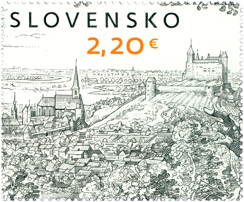 Známka je ryteckým prepisom diela Pohľad na Bratislavu od švajčiarskeho rytca 17. storočia Matthäusa Meriana st., pričom poštová známka je tvorená detailom veduty s Bratislavským hradom a Dómom sv. Martina, priblížila Dorčáková. Rozmery známky sú 54,4 x 44,4 milimetrov.