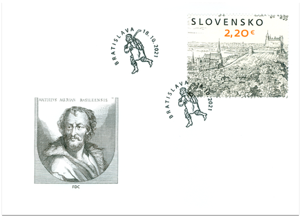 Súčasne so známkou vydá pošta obálku prvého dňa s pečiatkou FDC s dátumom 18. 10. 2021 a domicilom mesta Bratislava. "Na prítlači FDC je zobrazený portrét Matthäusa Meriana od norimberského rytca Joachima von Sandrarta," uviedla Dorčáková. Dodala, že FDC pečiatku tvorí figurálny motív chodca zo spodnej časti hárčeka.