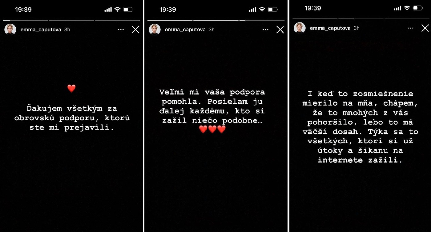 Na jej instagramovom profile sa však v utorok popoludní objavila reakcia na búrlivé udalosti včerajšieho dňa v tzv. príbehu prostredníctvom ktorého sa Emma poďakovala ľuďom za podporu a zároveň sa vyjadrila v tom zmysle, že chápe tých, ktorých to pohoršilo, pretože sa to týka všetkých, ktorí už útoky alebo šikanu na internete zažili...