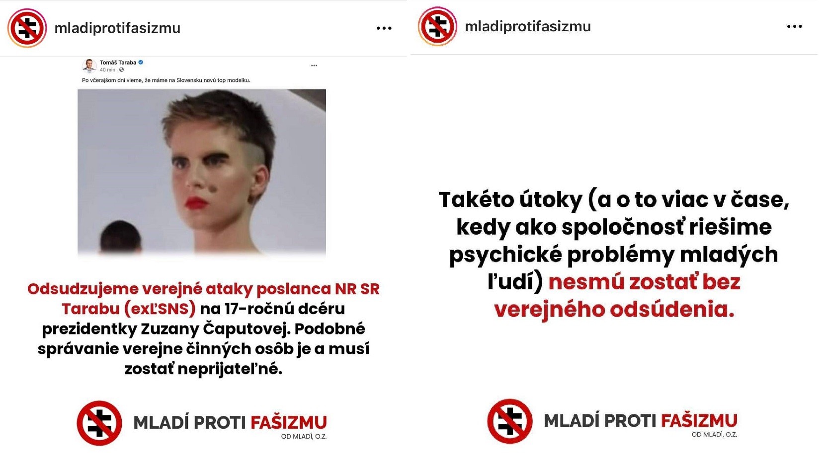 "Odsudzujeme verejné ataky poslanca NR SR Tomáša Tarabu (ex ĽSNS) na 17-ročnú dcéru prezidentky Zuzany Čaputovej. Emma Čaputová prešla pred podujatím FAshion LIVE! castingom a nebola nijakým spôsobom protežovaná. Svojej úlohy modelky sa zhostila profesionálne a prispela k vysokému umeleckému zážitku tohto podujatia. Rovnako odmietame urážlivé poznámky k jej vzhľadu a umeleckému make-upu. Za podujatím Fashion LIVE! stojí tím etablovaných odborníkov z oblasti vlasového stylingu a vizážistky, ktorých práca reflektuje vizuálnu predstavu samotných dizajnérov. Považujeme za absolútne neprijateľné, že poslanec Taraba verejne ponížil prezidentkinu dcéru a vyzývame ho, aby sa verejne ospravedlnil," napísala Barbara Jagušák - Heribanová, ktorá víkendové módne podujatie v nákupnom centre Nivy spoluorganizovala.