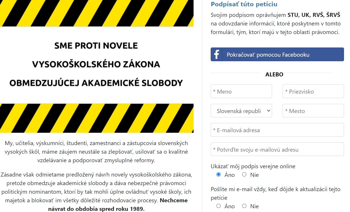 "My, učitelia, výskumníci, študenti, zamestnanci a zástupcovia slovenských vysokých škôl, máme záujem neustále sa zlepšovať, usilovať sa o kvalitné vzdelávanie a podporovať zmysluplné reformy. Zásadne však odmietame predložený návrh novely vysokoškolského zákona, pretože obmedzuje akademické slobody a dáva nebezpečné právomoci politickým nominantom, ktorí by tak mohli úplne ovládnuť vysoké školy, ich majetok a blokovať im všetky dôležité rozhodovacie procesy," uvádza sa v petícii. Dodali, že nechcú návrat do obdobia spred roku 1989. Pod petíciou je podpísaných viac ako 2100 podpisov.