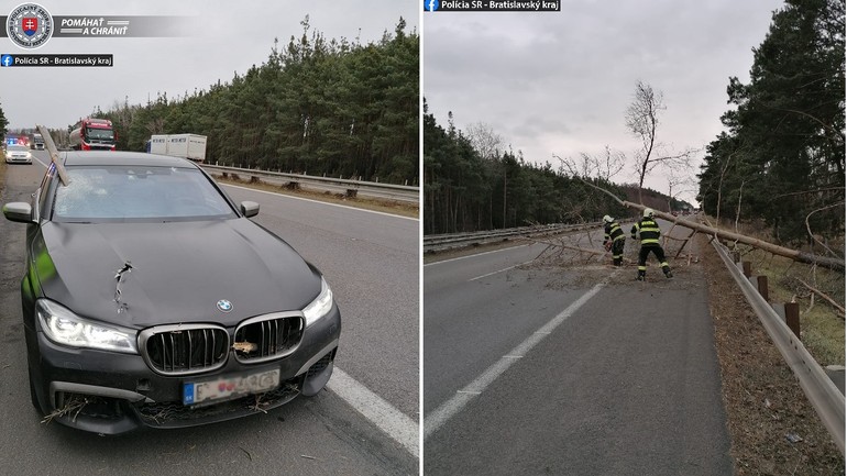 „Krátko po 14.00 h prišlo na 31 km v smere do Bratislavy z dôvodu silného vetra k pádu stromu na osobné vozidlo, ktoré týmto úsekom prechádzalo. K zraneniu osôb nedošlo," uviedla polícia na sociálnej sieti.