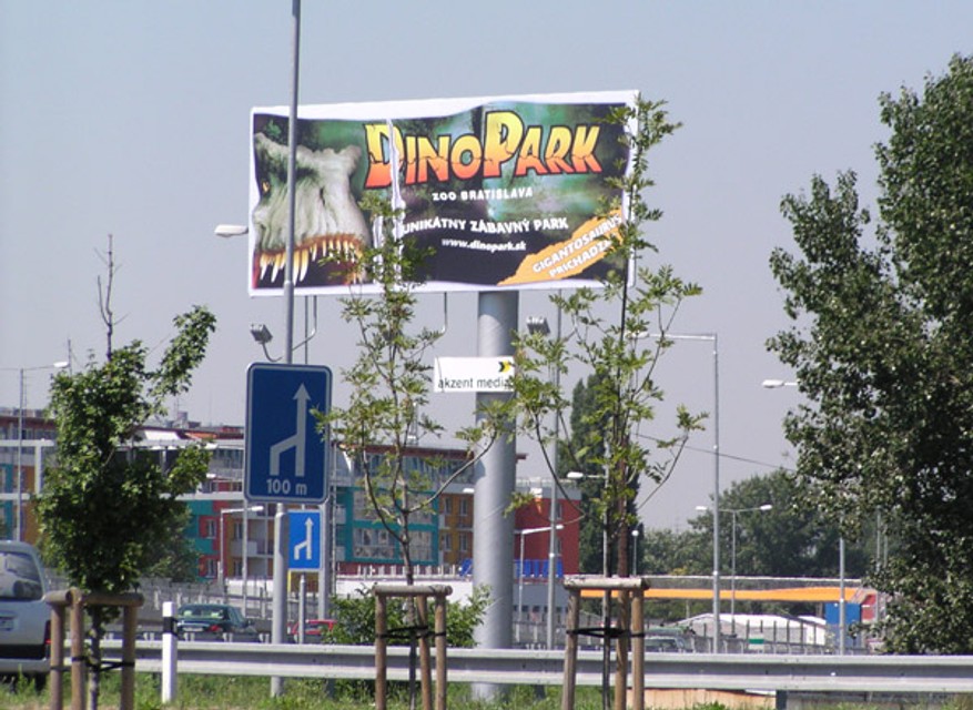 Nad cestným viaduktom takmer v strede cestnej komunikácie v smere od Dolnozemskej cesty na Most Apollo pri Prístavnom moste v Petržalke osadila spoločnosť Akzent Media reklamný megaboard bez stavebného povolenia.