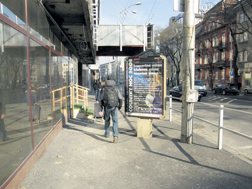 Na Námestí 1. mája sme pred hotelom Tatra objavili takmer uprostred chodníka reklamný citylight spoločnosti JCDecaux. To, že obmedzuje chodcov, je zrejmé. V Bratislave je to však možné.
