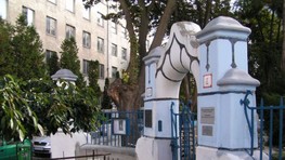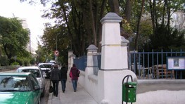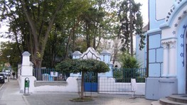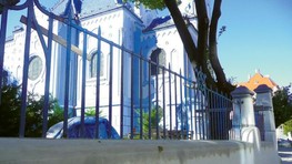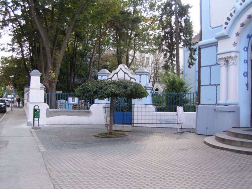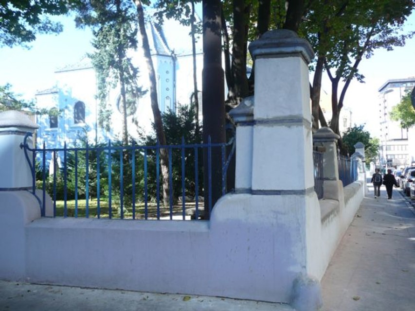 Secesný múr pri modrom kostolíku už stojí, v pôvodnej bledomodrej farbe - Mur5