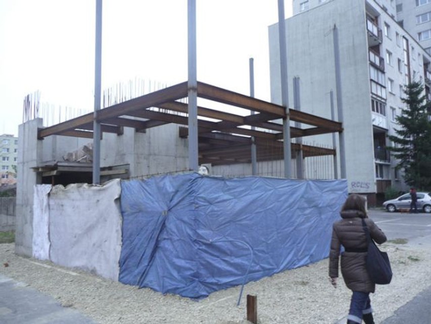 Na rohu ulíc Saratovská a Drobného, stavebníčka Zuzana Rapantová už rok prestavuje novinový stánok na polyfunkčný objekt. Pôvodne malo ísť o výmenu vnútornej dlažby, strešnej krytiny, okien a dverí novinového stánku, no stavebné práce nabrali väčší rozmer, a tak boli dúbravským stavebným úradom pozastavené.