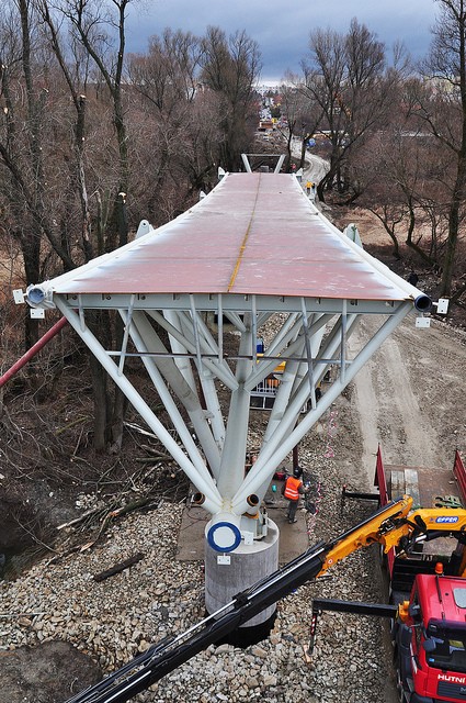 "Každým dňom je vidieť výrazný pokrok. K dnešnému dňu je ukončená spodná stavba mosta. Momentálne veľmi intenzívne prebiehajú práce na osadení oceľovej konštrukcie cyklomosta," priblížil Frešo.