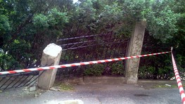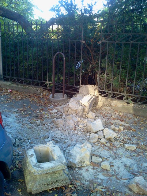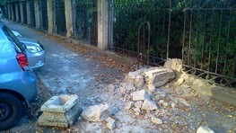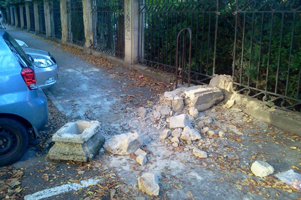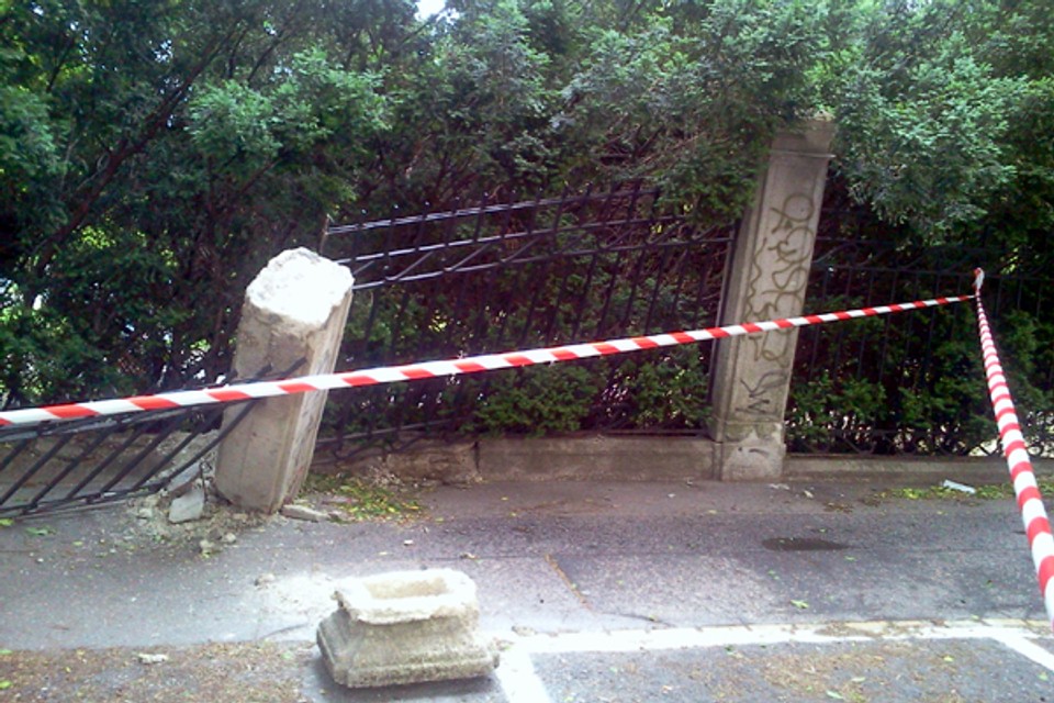 „K poškodeniu oplotenia prišlo pravdepodobne v noci zo soboty na nedeľu z 25. na 26. mája 2013. Poškodené boli dva stĺpy a dve železné polia,“ povedal hovorca Starého Mesta Tomáš Halán. Čitateľ Ladislav Svršek tvrdí, že prvý stĺp padol už v októbri 2012. Už vtedy bolo vraj badateľné, že sú narušené aj ďalšie stĺpy.