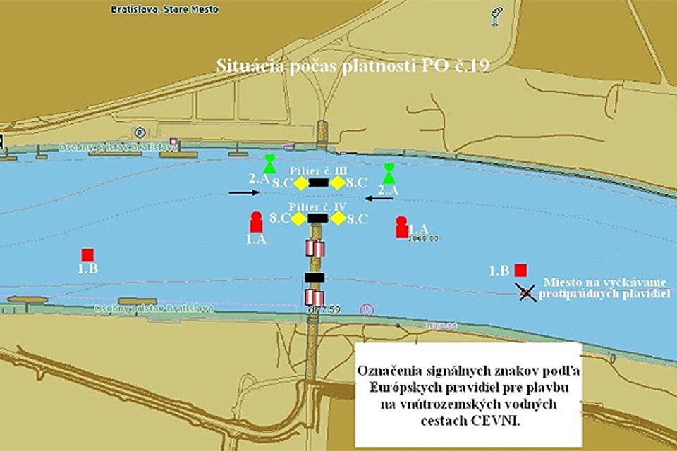 Plavba 3. mostným otvorom bude obmedzená na maximálne rozmery zostavy plavidiel na šírka 24 metrov a dĺžka 135 metrov. Z tohto dôvodu budú plavidlá plávajúce proti prúdu dávať prednosť plavidlám plávajúcim po prúde a budú vyčkávať pri pravobrežnom okraji plavebnej dráhy pod červenou plávajúcou bójou na riečnom kilometri 1867,80.