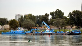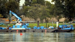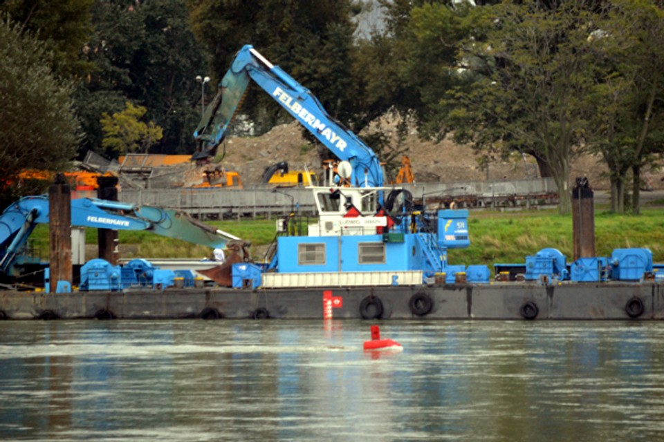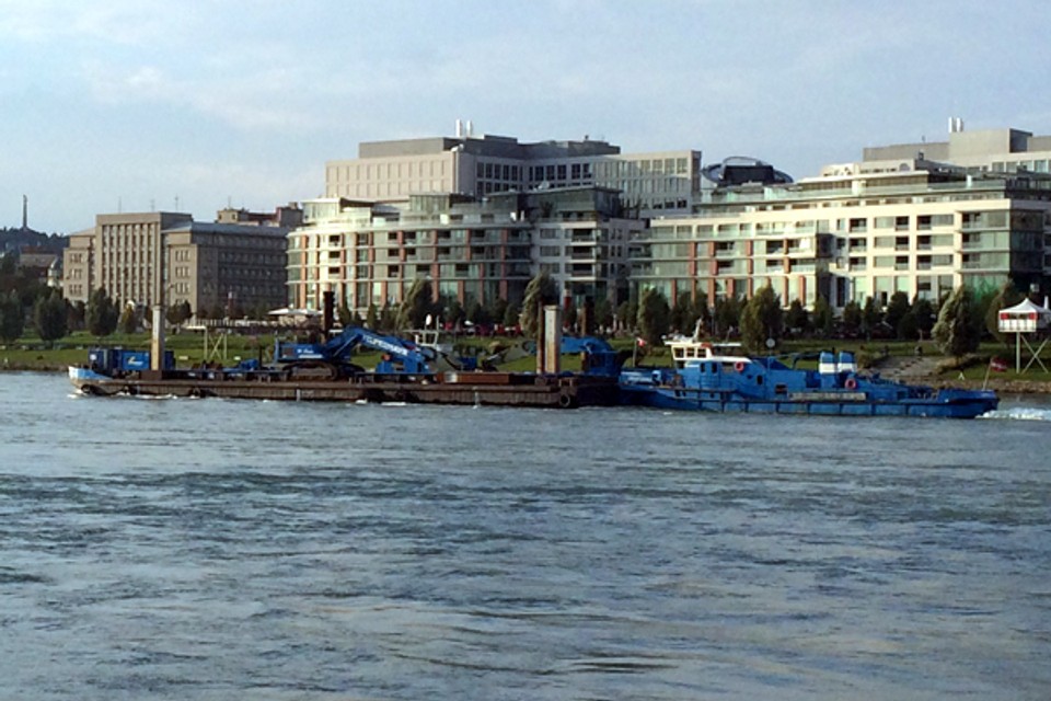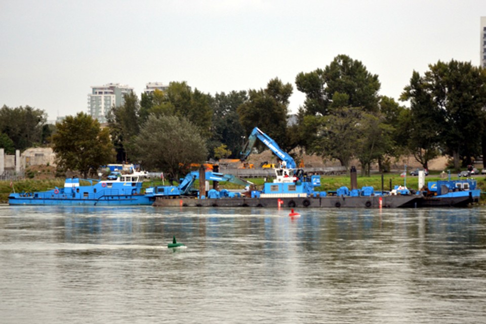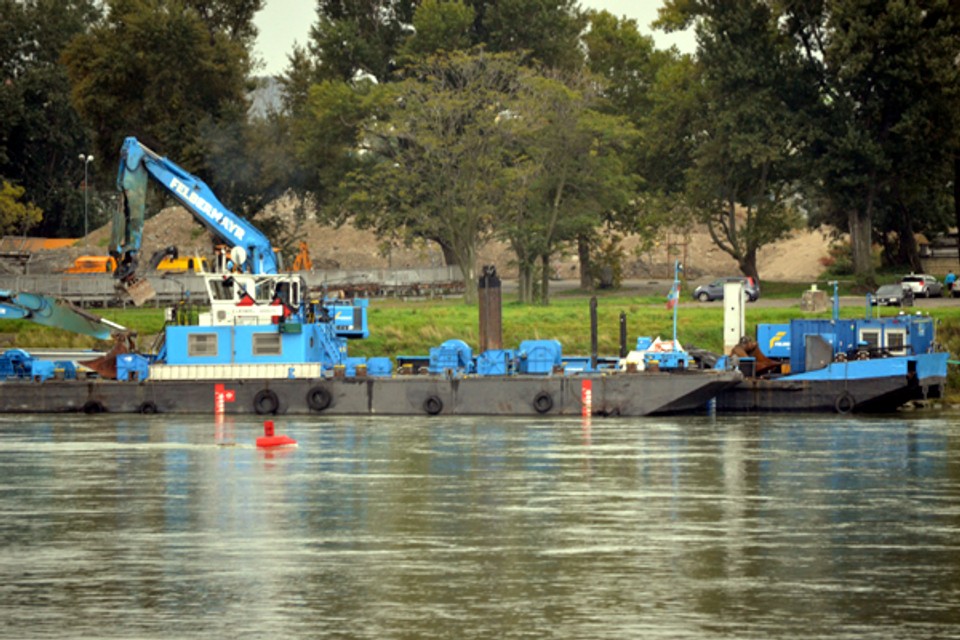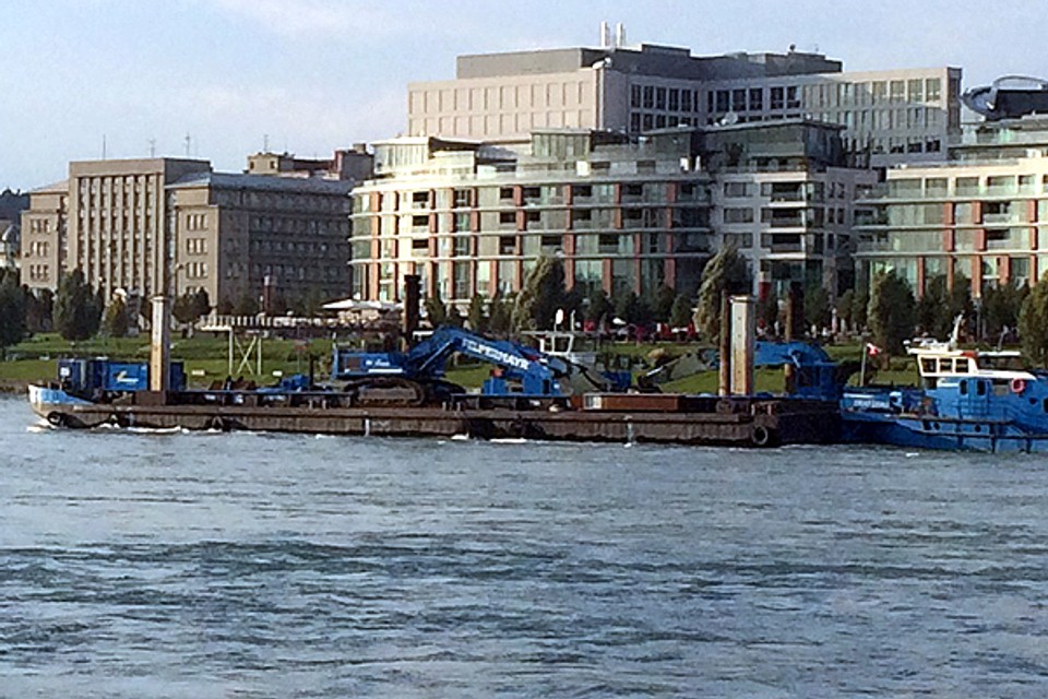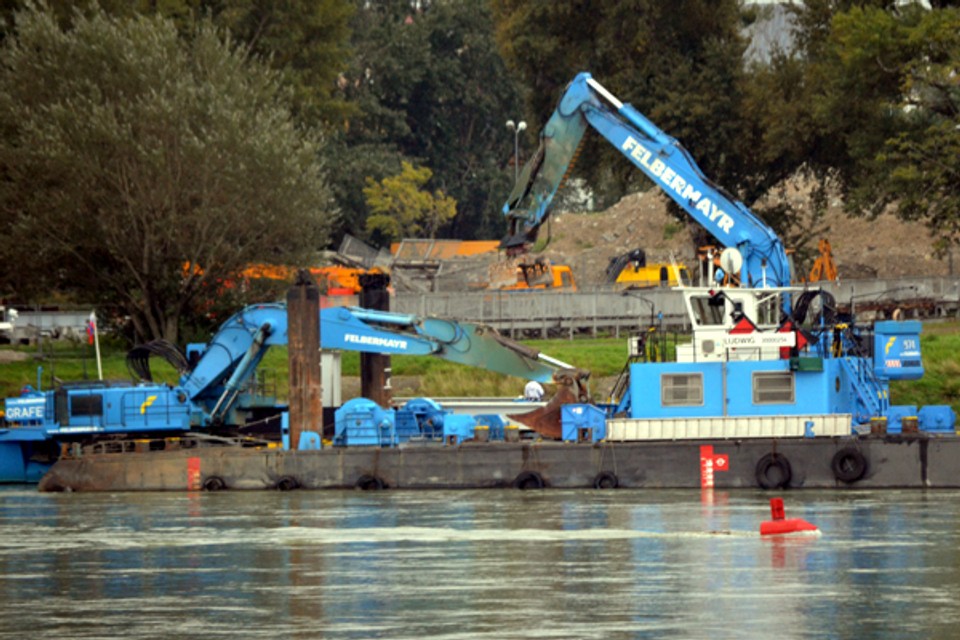 AKTUALIZOVANÉ: Ako sa v piatok ukázalo, tlačný čln rakúskej spoločnosti Febelmayr dotlačil do Bratislavy dve lodné plošiny s bagrami. Jednu z nich v piatok 26. septembra 2014 krátko pred 12.00 h dotlačil k pilieru č. 3, kde báger začal s úpravou dna v okolí piliera. Podľa vyjadrenia vedúceho stavby Petra Tekeľa zo spoločnosti Eurovia SK z 18. septembra 2014, lodná plošina zakotví pri pilieri Starého mosta, do vody sa z lode spustia na dno železné piliere, naktorých bude loď prakticky stáť. To zabezpečí stabilitu celej plošiny.
