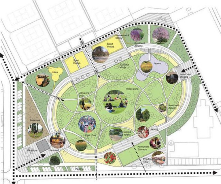 Na ploche 17.655 štvorcových metrov (m2) tak majú podľa predloženého zámeru vzniknúť cyklistická a inline-dráha, bežecká dráha, lezecká stena, tenisové kurty, multifunkčné ihrisko, prírodný amfiteáter, kaviarne, priestor na hranie petangu či v jednom variante aj jazierko. V parku budú tiež tri móla, pričom každé z nich má mať inú funkciu. Na jednom si budú môcť návštevníci posedieť, na druhé majú umiestniť fitnes stroje a pingpongové stoly a ďalšie bude vyhliadkové nad jazierkom.