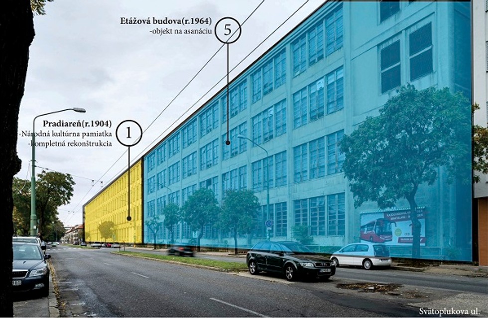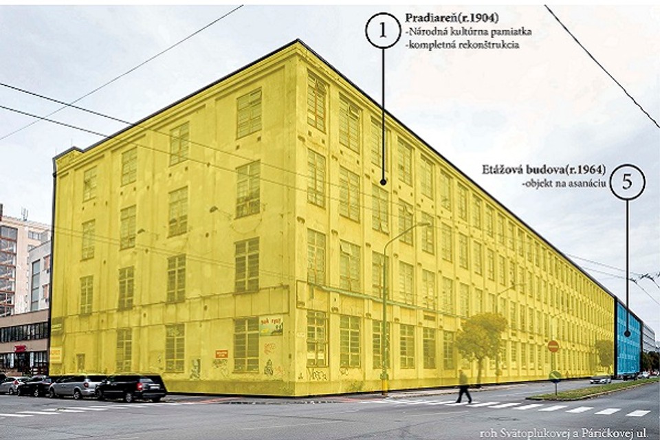 V najbližších dňoch, od 27. februára, bude asanovaný objekt č. 5, tzv. Etážová budova (na priložených obrázkoch v modrej) z roku 1964, ktorá je v bezprostrednom susedstve pamiatkovo chráneného objektu Pradiarne z roku 1904 (na priložených obrázkoch v žltej). „Z tohto dôvodu bude potrebné postupovať pri asanácii opatrne a bude trvať zrejme dlhší čas, aby nedošlo k žiadnemu poškodeniu chráneného objektu. Asanácia bude prebiehať pod dohľadom Krajského pamiatkového úradu, najmä čo sa týka miesta dotyku s Pradiarňou,“ vysvetľuje Silvia Ferencová, manažérka marketingu a starostlivosti o zákazníkov spoločnosti YIT Slovakia.