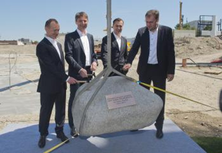 Kameň poklepali zástupca developera Jozef Oravkin, primátor mesta Ivo Nesrovnal, partner Zaha Hadid Architects Patrick Schumacher a starosta mestskej časti Bratislava - Staré Mesto Radoslav Števčík.