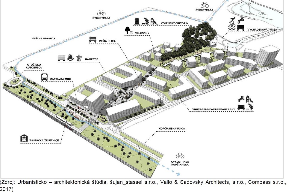 Na spomínanom území by mali vyrásť vily a bytovky. „Primárnou funkciou navrhovaného polyfunkčného komplexu bude bývanie trvalého charakteru a prechodného ubytovania, realizované v nízkopodlažných bytových domoch, v menšej miere v mestských vilách a objektmi slúžiacimi pre prechodné ubytovanie (hotel, penzión, študentský domov, dom seniorov a pod.) s doplnením o vybavenostné funkcie, ktoré plnohodnotne dopĺňajú charakter daného územia. Organizácia obytného územia je riešená s cieľom formovania obytných plôch do voľných mestských solitérov a blokov s nezastavanými verejnými/poloverejnými priestormi so zeleňou, pochôdznymi plochami s detskými / multifunkčnými ihriskami doplnenými o vodné prvky a drobnú architektúru,“ uvádza sa v dokumente.