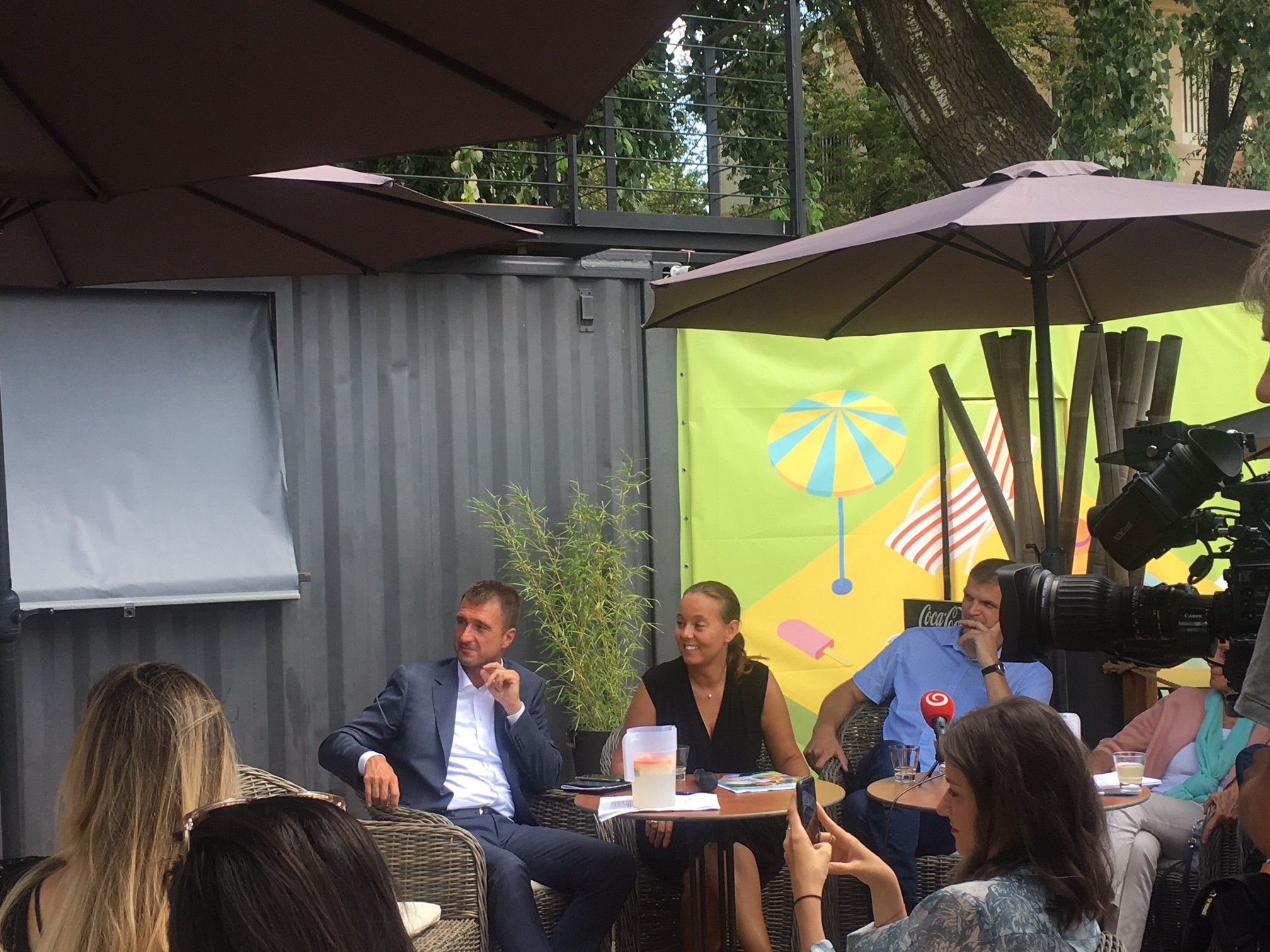 Účastníci tlačovej besedy na Pláži Staré Mesto, na ktorej jeho účastníci predstavili nový projekt Eurovea City. Zľava Peter Korbacka, Olga Hammer a Ľubomír Kaštan.