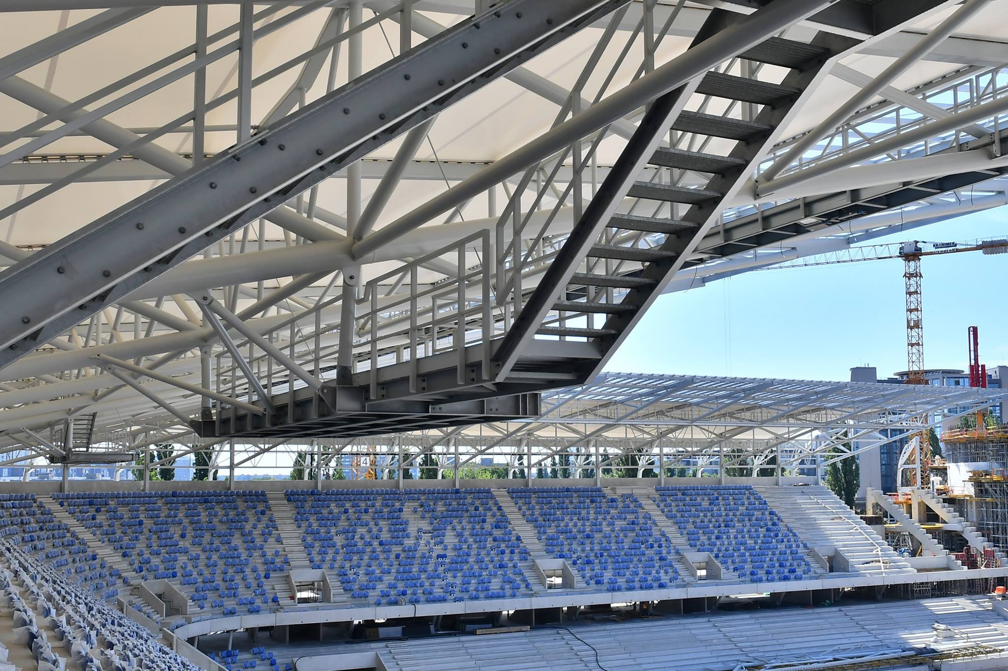 Takmer všetky tribúny sú už kryté, teda pod strechou, ktorú tvorí takáto dômyselná konštrukcia...
