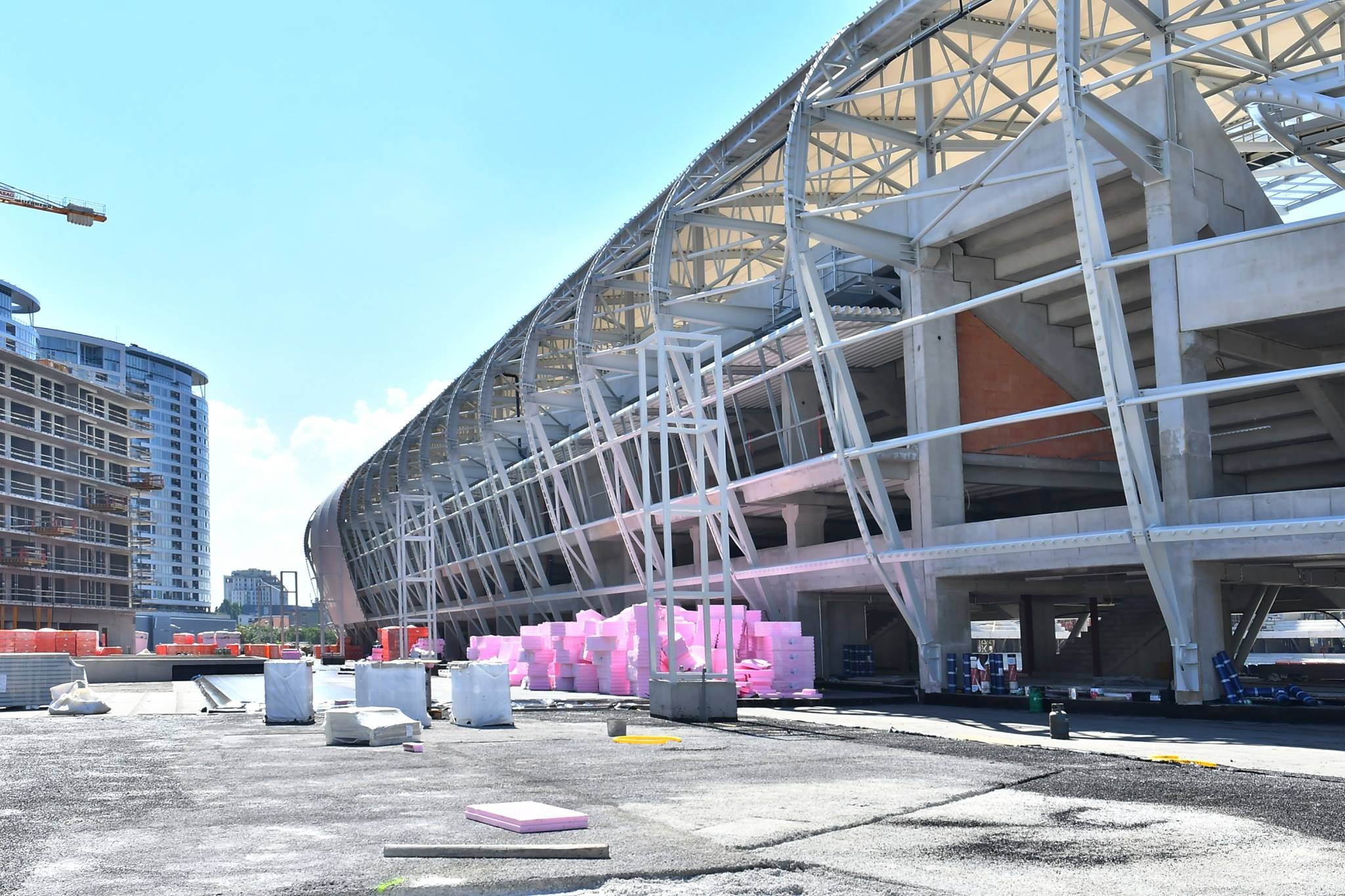 Postupne sa pokračuje v oplášťovaní tribún z vonkajšej strany Národného futbalového štadióna, pri ktorom sa súčasne stavia aj bytový komplex Tehelné pole (vľavo).