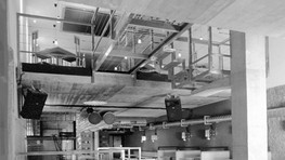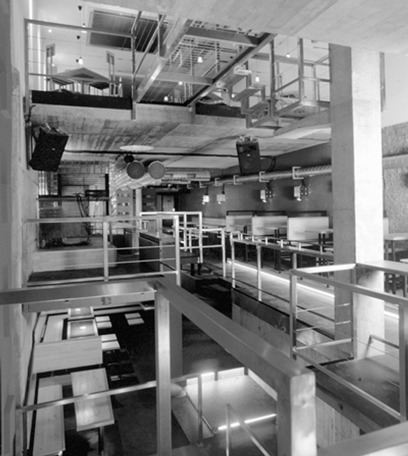 Interiér domu, v ktorom je kaviareň a pub, pôsobí ako jama kráteru. Cez tri podlažia prehĺbeného priestoru sa tiahne široký pás červeného náteru. Od prízemia až po druhý suterén siaha dutina v jadre domu, v najvyššej úrovni preložená len subtílnou lávkou. Vo vnútri dominujú zábradlia z brúseného nerezu, rúry vzduchotechniky a neóny vytvárajúce modrú ilumináciu. Veľa svetlého dreva, z ktorého sú vyrobené lavice, stoly a stoličky tento chladný betónovo-železný kráter otepľujú a poľudšťujú ho.