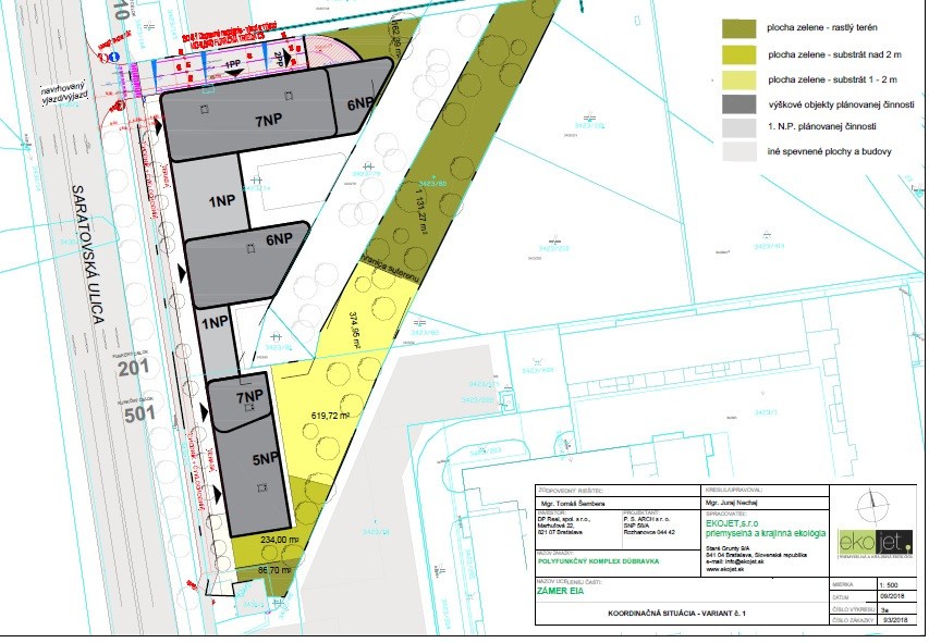"Zo severnej strany je pozemok ohraničený areálom mestskej polície, z východu nevyužívanými plochami porastenými antropogénnou krovinovou vegetáciou, zo západu Saratovskou ulicou a z juhu obytným komplexom, kde v súčasnosti prebieha výstavba nových objektov," píše sa v zámere. Na dotknutom pozemku sa v súčasnosti nenachádzajú stavebné objekty. Podľa investora ide o voľné parcely, ktoré sú dlhodobo nevyužívané. "Výstavbou navrhovanej činnosti sa prispeje k ucelenému výzoru novej výstavby a k doplneniu vhodným mestotvorným prvkom," deklaruje v projekte.