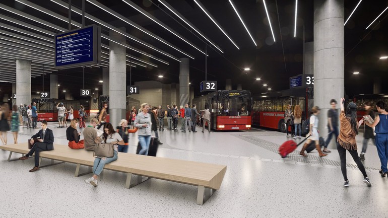 "Nájdete tu dnes nainštalované schodisko vedúce do autobusovej stanice. V tejto časti je výška stropov až 11 metrov. Priestory tak vytvárajú pocit menšej katedrály. Aby mali autobusy dostatok miesta na pohyb, sú niektoré nosné stĺpy od seba vzdialené až 24 metrov," priblížil developer. Podarilo sa mu to dosiahnuť aj vďaka technológii predpínania. Tá sa bežne používa na mostných konštrukciách.