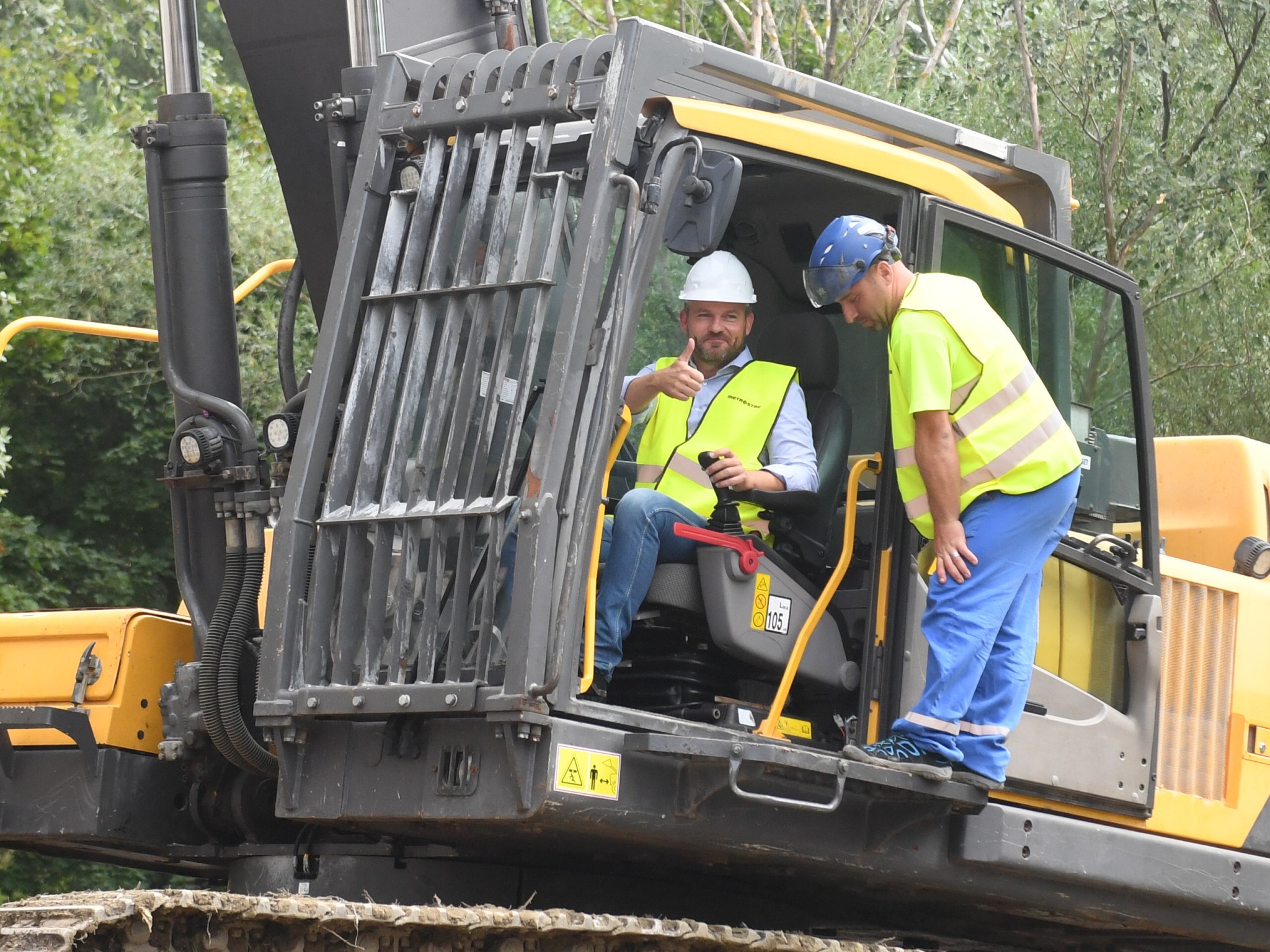 Peter Pellegrini smeruje do v kabíny bagra, aby spustil búracie práce na skelete nemocnice na Rázsochách