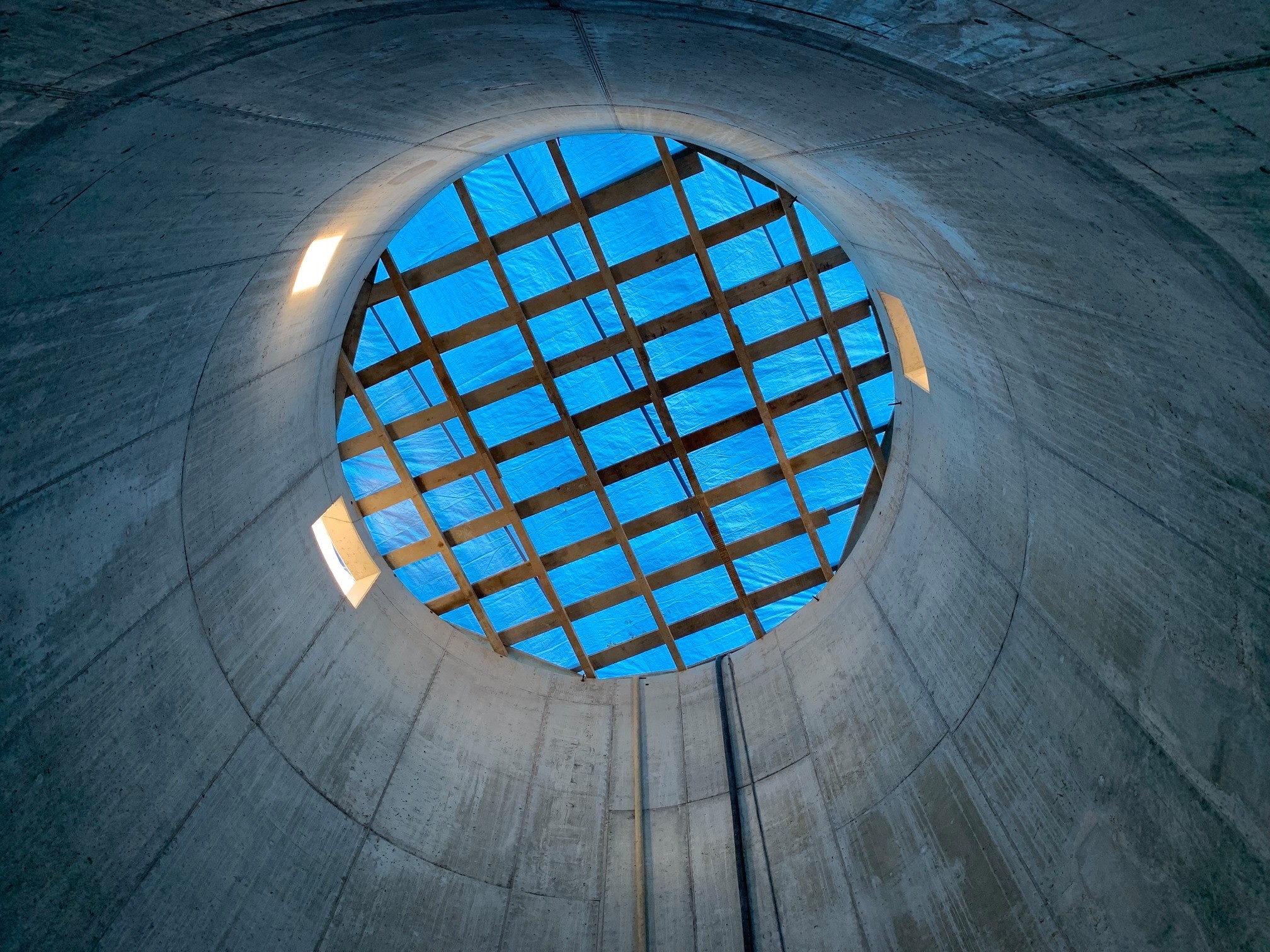 Spodný pohľad do vzduchotechnickej šachty, ktorá sa využíva pre transport vzduchu a zabezpečenie jeho cirkulácie:
