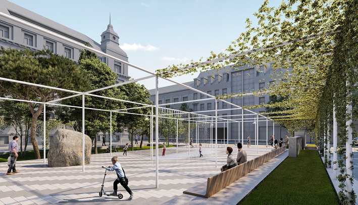 Architekti námestie delia na dve časti s jednou zníženou pod úroveň okolia, na hrane vymedzujúcej zníženú plochu je priestor pre neformálne sedenie. Okrem popínavej zelene vytvárajúcej tieň nad priestorovou mriežkou, navrhujú priniesť na časť námestia bez podzemných priestorov vzrastlé stromy, ktoré námestie obkolesené fasádami budov príjemne zatieňujú a ochladzujú. Povrch na námestí je navrhnutý tak, aby privádzal dažďovú vodu do tej časti námestia, kde budú rastliny a kde bude môcť vsiaknuť.
