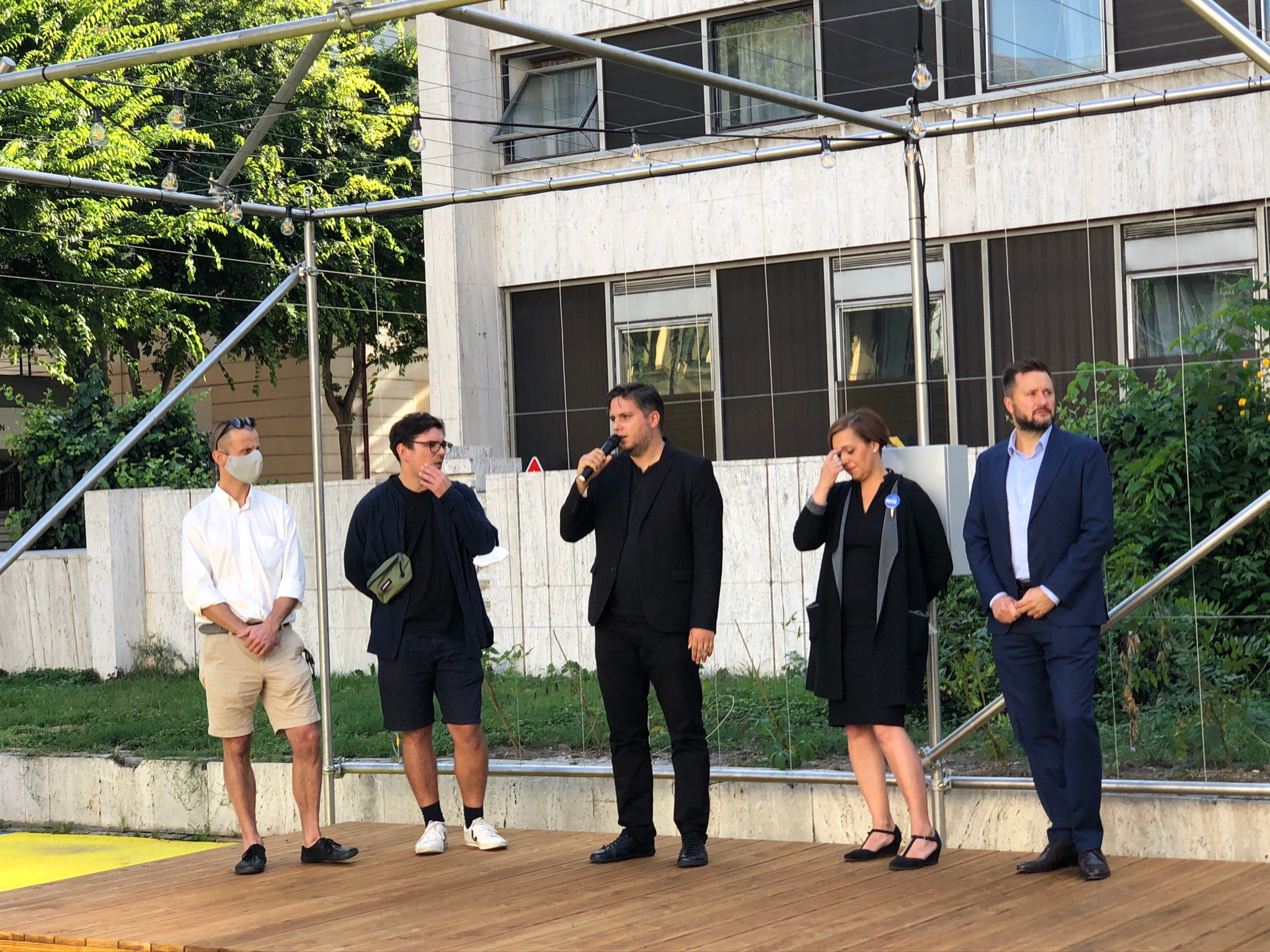 Dočasný pavilón, ktorý tu pribudol, zostane na námestí do obdobia, kedy hlavné mesto začne s jeho obnovou podľa návrhu vybratého v súťaži. Postupne jeho obvodové „steny” obrastú popínavé rastliny nasadené v kvetináčoch, a tým zároveň oddelia a vymedzia priestor námestia od ulíc Gorkého a Jesenského.