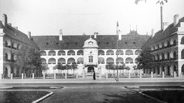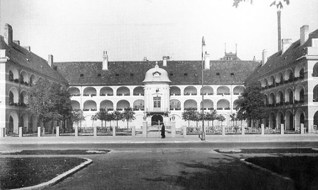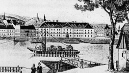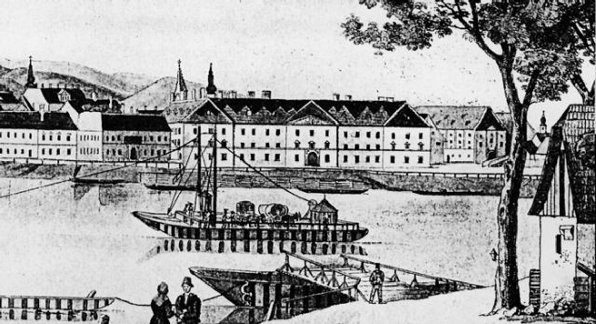 1. Vodné kasárne na rytine z 19. storočia - vtedy ešte stálo aj štvrté krídlo objektu zo strany dunajského nábrežia.