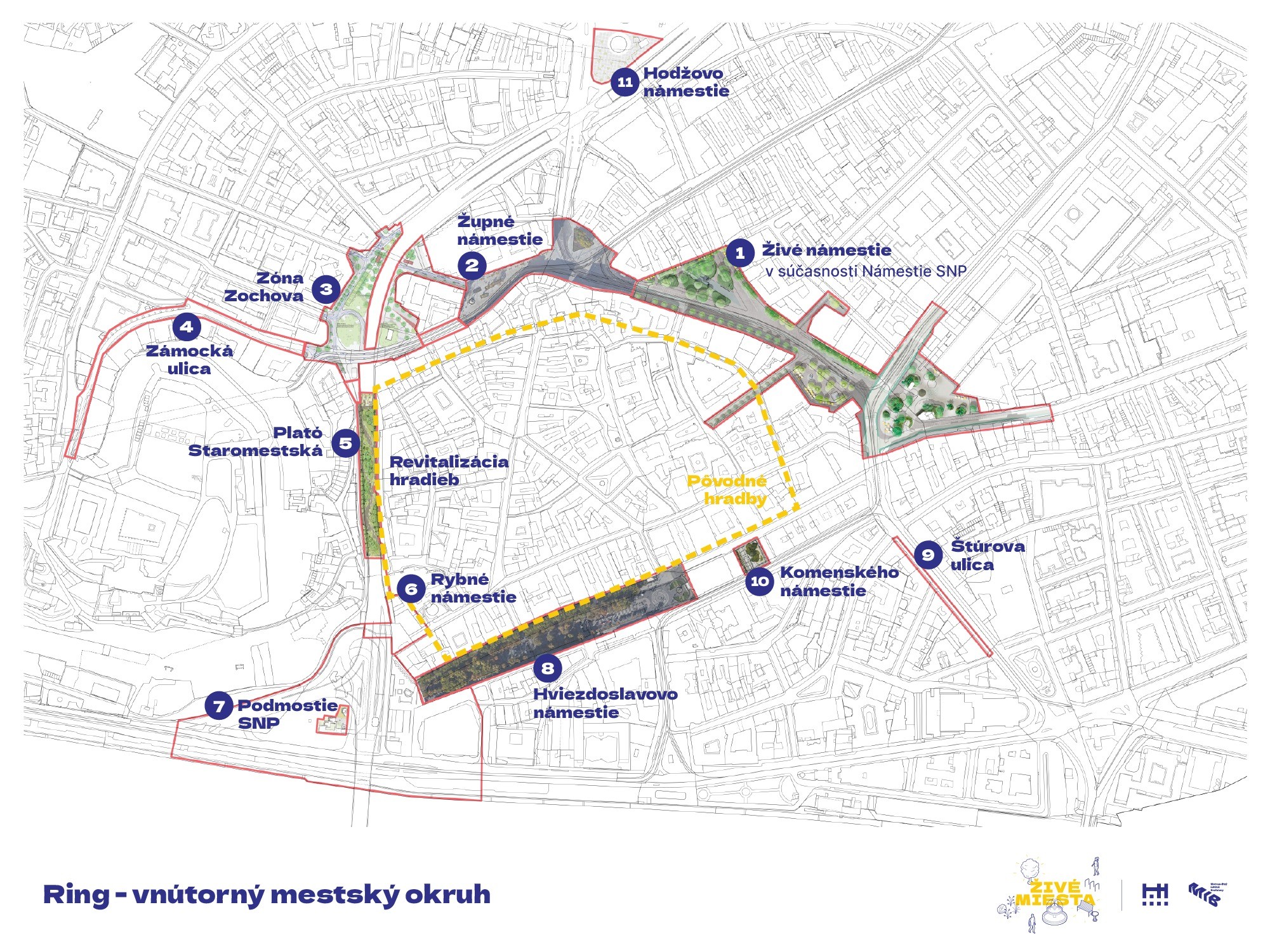 Nad Staromestskou ulicou, ktorá v 70. rokoch rozdelila centrum mesta, má vzniknúť približne 218-metrov dlhé a 20-metrov široké Plató pre peších. Nová plocha scelí Staré Mesto a prinavráti chýbajúci verejný priestor. Pribudne množstvo zelene, detské ihriská, workoutové preliezky pre dospelých a plató má pomôcť túto lokalitu ozdraviť aj odhlučnením frekventovanej ulice pod ním.