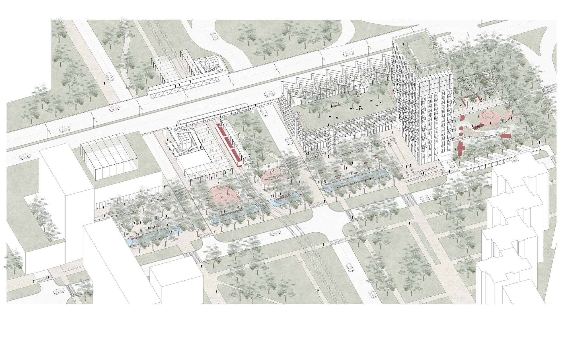 Architekti z A B.K.P.Š. navrhli umiestniť všetky požadované funkcie do jednej komplexnej stavby, ktorú tvorí nižší P+R parkovací dom a vyššia budova s občianskou vybavenosťou v parteri, škôlkou a strediskom pre seniorov v nižších poschodiach, a nájomným bývaním vo vyšších poschodiach. "Porotcov presvedčil práve spôsob, ako architekti vyriešili rozloženie jednotlivých funkcií v priestore, keďže súťažné zadanie striktne neurčovalo koľko budov majú architekti navrhnúť. Menej zastavanej plochy znamená viac miesta pre verejné priestory s námestím a ihriskami, ktoré vhodne prepájajú okolitú zástavbu sídliska, nové obchody aj električkovú trať," spresnila AnnaMária Krchňavá z Metropolitného inštitútu.