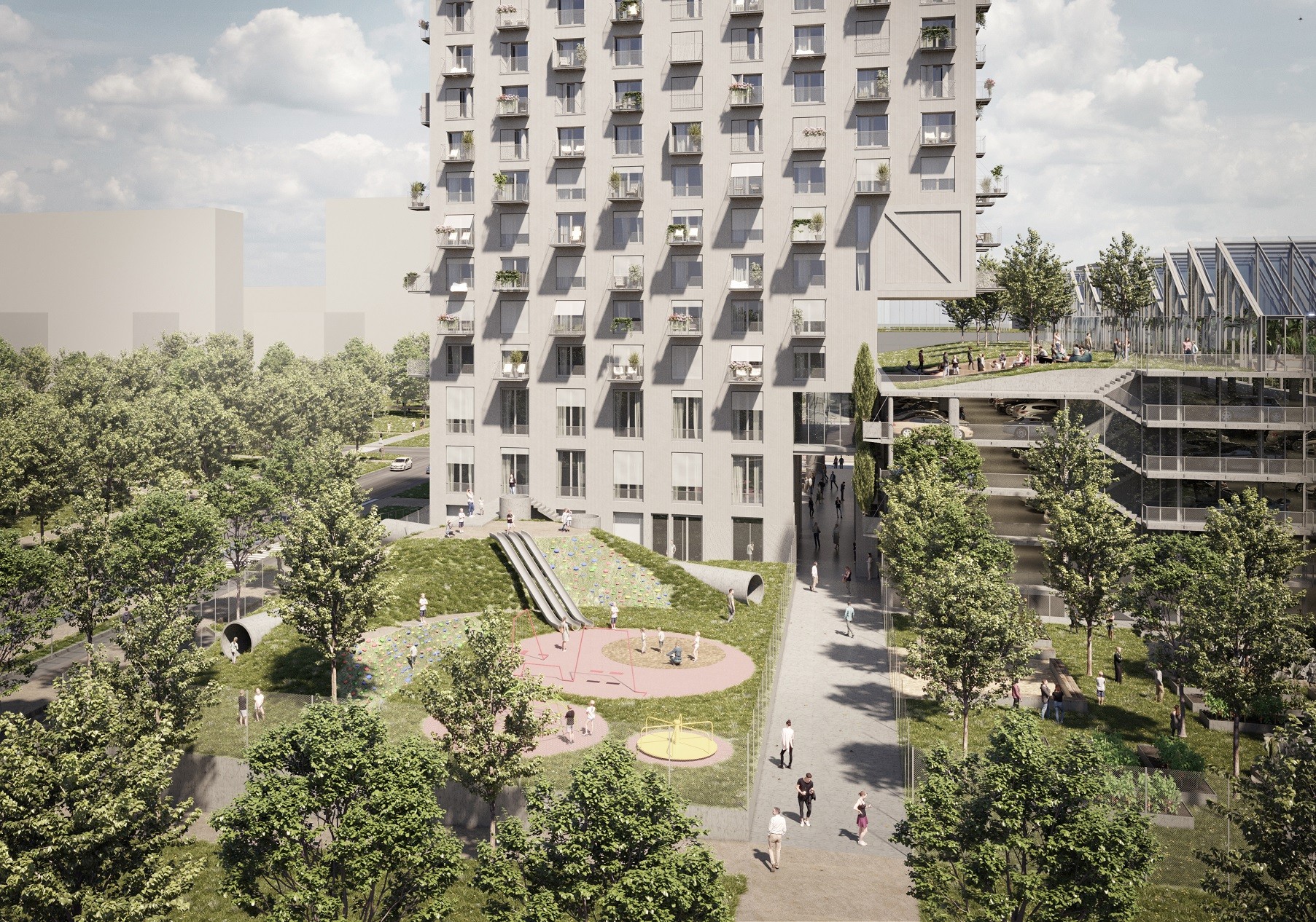 Parkovací dom architekti umiestnili popri Panónskej ceste, čo vytvára akustickú bariéru a priaznivejšie prostredie pre severnú stranu riešeného územia s pôvodnou sídliskovou zástavbou. Bariéra má hlavne slúžiť pre chodcov prichádzajúci zo zástavky do svojich domovov.