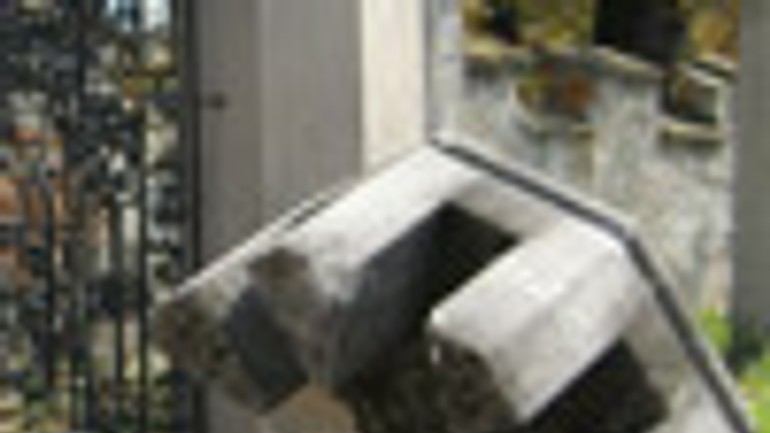 Zdevastovaný veľký štvorec trávnika, asfaltové chodníky prekryté hrubou vrstvou bahna, odrazená a rozbitá pies-kovcová hlavica stĺpa s cimburím.