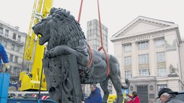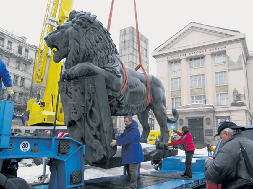 Z pylónu Pamätníka československej štátnosti pred budovou Slovenského národného múzea na Vajanského nábreží v pondelok zložili šesťtonovú sochu leva. Tá by sa mala stať súčasťou Pamätníka generála Milana Rastislava Štefánika pri novostavbe Slovenského národného divadla.