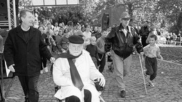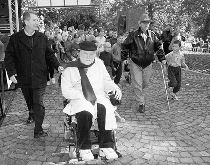 Vítaní boli aj postihnutí občania na invalidných vozíkoch. Na otváracom behu sa zúčastnili aj herci Ľubo Roman, Pavol Mikulík a bývalý úspešný účastník cyklistických Pretekov mieru Ján Konečný (vpravo). Podujatie mediálne podporili aj Bratislavské noviny.