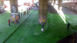 Pod bratislavským Novým mostom, kde sú zastávky autobusov MHD, je symbolické "zelené námestie" s rozlohou 1200 metrov štvorcových. Dnes v noci ho sýtou zelenou farbou maľovalo 25 priaznivcov Občianskeho združenia Mestské zásahy.