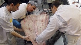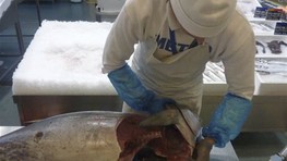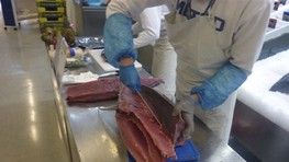 Od 10:30 h budú mať Bratislavčania možnosť vzhliadnuť porciovanie obrovského tuniaka v réžii vedúceho oddelenia rýb Mareka Kadlečíka a zamestnanca METRO Filipa Raksányiho.