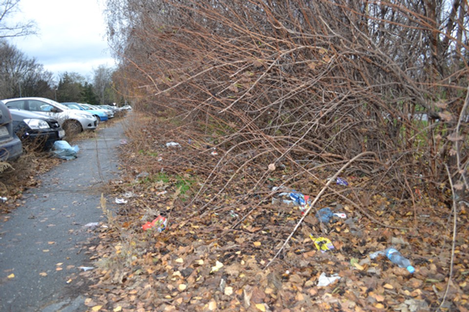 Jeden taký je aj na Ostredkoch medzi Meteorovou ulicou a Trnavskou cestou. Ide o pozemok, na ktorom sa nachádza parkovisko, chodník a trochu zelene. Okrem prázdnych fliaš, obalov od potravín či kusov oblečenia sme na parkovisku a v kríkoch na páse zelene, ktorá oddeľuje parkovisko a chodník od Trnavskej cesty, našli aj prázdne injekčné striekačky. Pri niektorých parkovacích miestach si motoristi vytrhali burinu, tú však odhodili na trávnik pri chodníku. Neporiadok sa nepáči viacerým, no majiteľovi pozemku sa určite nepáči upratovať po iných, ktorý mu tu robia smetisko.