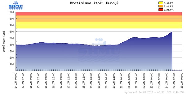 24. 05. 2015 | 16:00 h: Hladina Dunaja v Bratislave stúpla na 635 cm a blíži sa k hranicu 1. stupňa povodňovej aktivity (650 cm). V Devíne dosiahol Dunaj v tom istom čase 584 cm. Teplota vody v Bratislave klesla na 12,5 stupňa Celzia. Podľa hydrológov SHMÚ možno podľa predpokladaného vývoja poveternostnej situácie očakávať, že v hornej časti slovenského úseku Dunaja dôjde ku kulmináciu hladiny vo večerných hodinách.