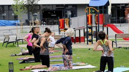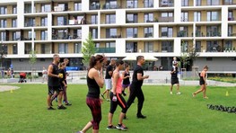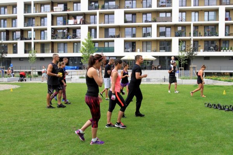 Obyvatelia Slnečníc si motivačne spolu zacvičili na upravenom trávniku pred zrakmi návštevníkov protiľahlej kaviarne, kým deti sa ovlažovali v miestnej fontáne. "Máme to odtiaľto asi 5 minút na hrádzu, čo aj využívame pre relax na korčuliach či na bicykli, ale do tela so susedmi si vieme dať vďaka vhodným verejným priestranstvám doslova aj pred vchodom do domu," povedal Roman (35), vyznavač populárneho cross-fitu.