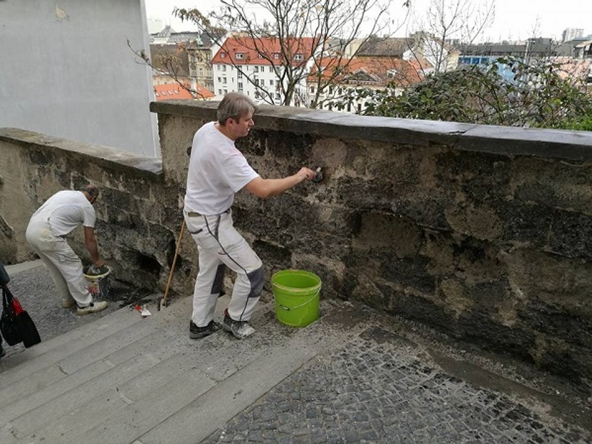 Členovia Bratislavského okrášľovacieho spolku využili pekné počasie v uplynulých dňoch a niekoľko dobrovoľníkov sa pustilo do opravy zničeného múrika na Zámockých schodoch.