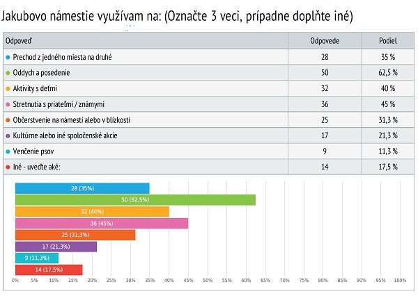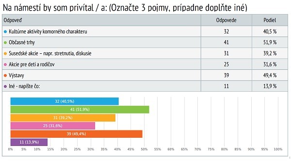 Z doterajšieho prieskumu medzi obyvateľmi vyplýva, že by uvítali viac občasných trhov, výstav, komunitných aktivít, ale i kultúrnych aktivít komorného charakteru pri zachovaní pokojného charakteru námestia. Tento priestor miestni podľa odpovedí najviac využívajú na oddych, stretnutia s priateľmi a aktivity s deťmi. Na námestí ľudia najviac oceňujú, a teda by to radi zachovali, zeleň, jeho pokojný charakter a detské ihrisko.