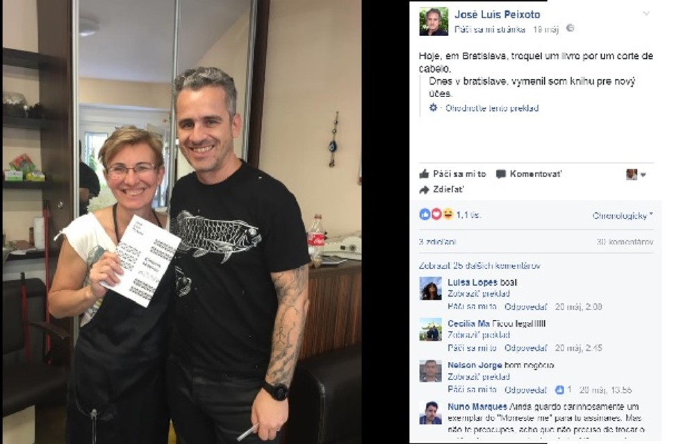 „Ponúkol mi ju ako darček a ja som sa rozhodla, že mi nemusí zaplatiť za ostrihanie,“ povedala na margo tohto ich výmenného obchodu pani Lýdia, ktorá tak urobila možno najlepší kšeft svojho života. Dostala totiž knihu priamo od autora aj s osobným venovaním, čo má cenu, ktorá sa nedá vyčísliť peniazmi. To, že ide o mimoriadne populárneho človeka pochopila vo chvíli, keď fotografiu z návštevy ich kaderníctva na Šoltésovej ulici zavesil na Facebook a tá sa zapáčila vyše 1100 ľuďom, čo je o 300 viac než iná snímka, na ktorej je pápež František s jednou z knižiek tohto svetoznámeho 43-ročného portugalského autora.