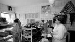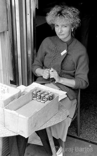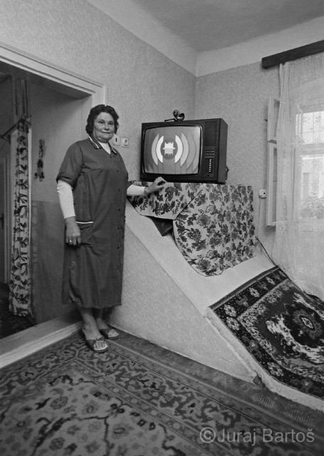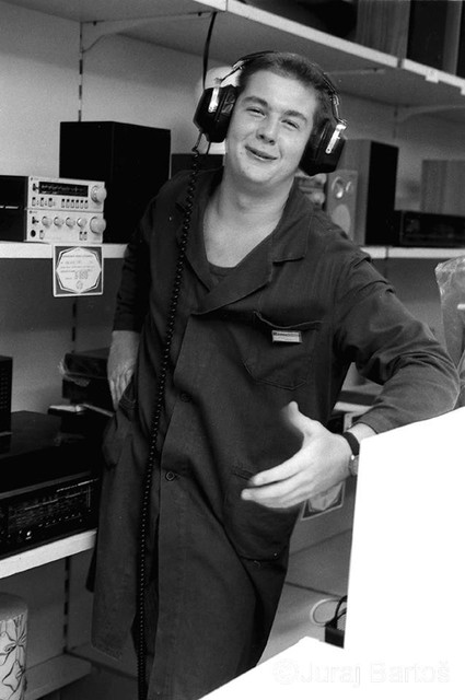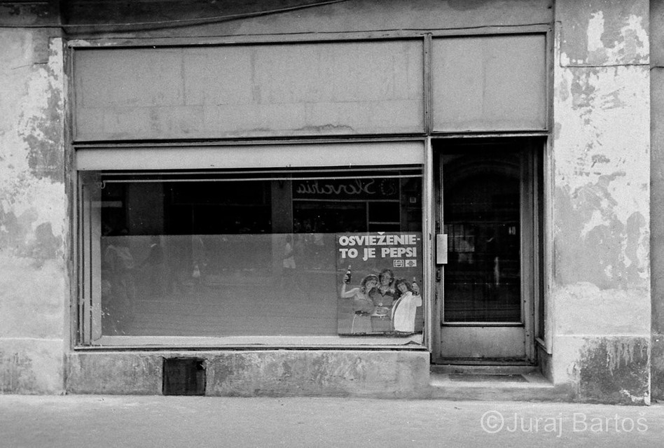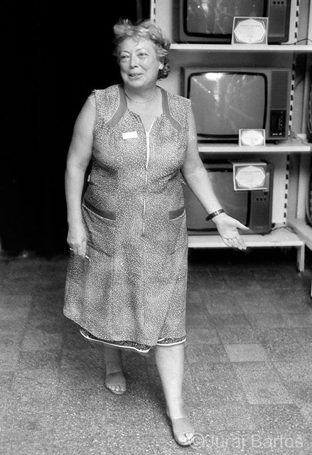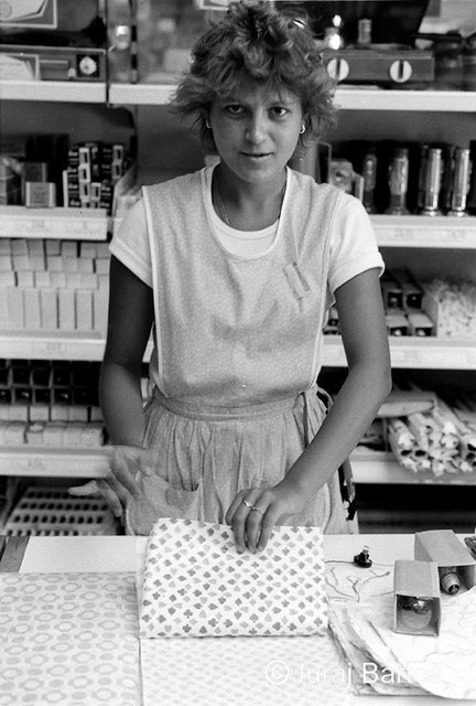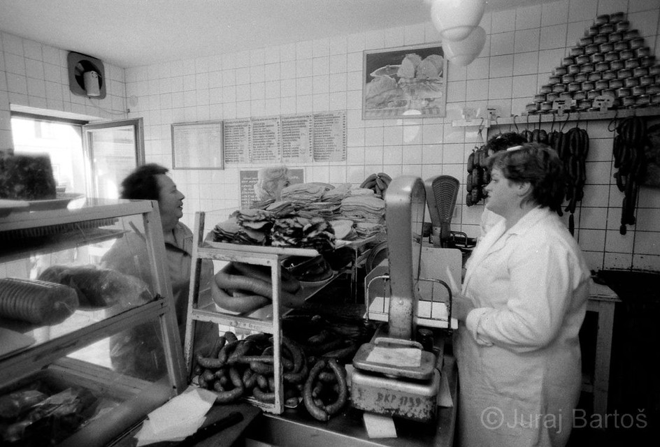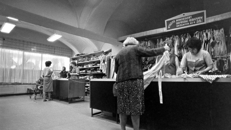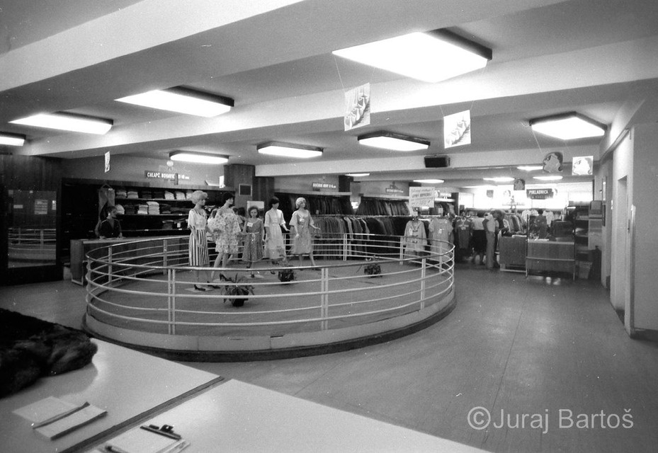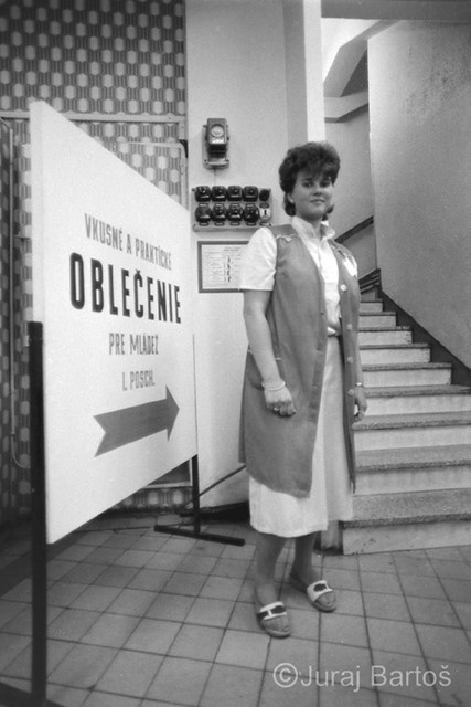 Nákup v obchode s oblečenímPrázdne obchody, usmiati predavači, ženy s trvalou na hlave, monštrózne figuríny v odevoch a v elektre na výber ešte aj čierno-biele televízory. Realitu na Obchodnej ulici zachytil v roku 1986 svojím objektívom fotograf Juraj Bartoš.