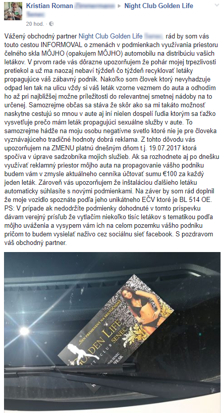 Bývalého kandidáta na post starostu Petržalky letáky erotického klubu zo Senca, ktoré si pravidelne nachádzal za stieračom svojho auta, nahnevali natoľko, že sa rozhodol napísať na facebookovú stránku klubu takýto príspevok: