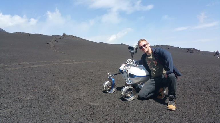 Michal Smíšek s vesmírnym robotom na sopke Etna.Už tento týždeň sa v bude konať v Bratislave ďalšie zo série podujatí vedecká kaviareň, na ktorej sa bude diskutovať o prieskume slnečnej sústavy prostredníctvom špičkových technologických robotických systémov.